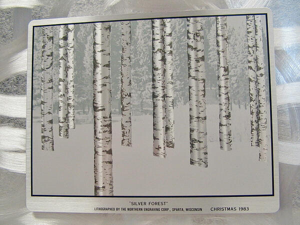 This Holiday card from 1983 showcases how much depth can be achieved by using a basic mechanical finish on aluminum. Each of the tree trunks in the foreground of the image is enhanced with a vertical engine stripe.